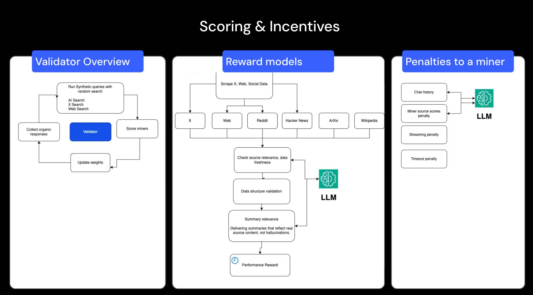 After evaluating structure and source quality, validators focus on the accuracy of miner-generated summaries. They use LLMs to ensure the summaries accurately reflect the original content, assessing them for depth, clarity, and precision. Summaries that include fabricated details or misleading statements are penalized.